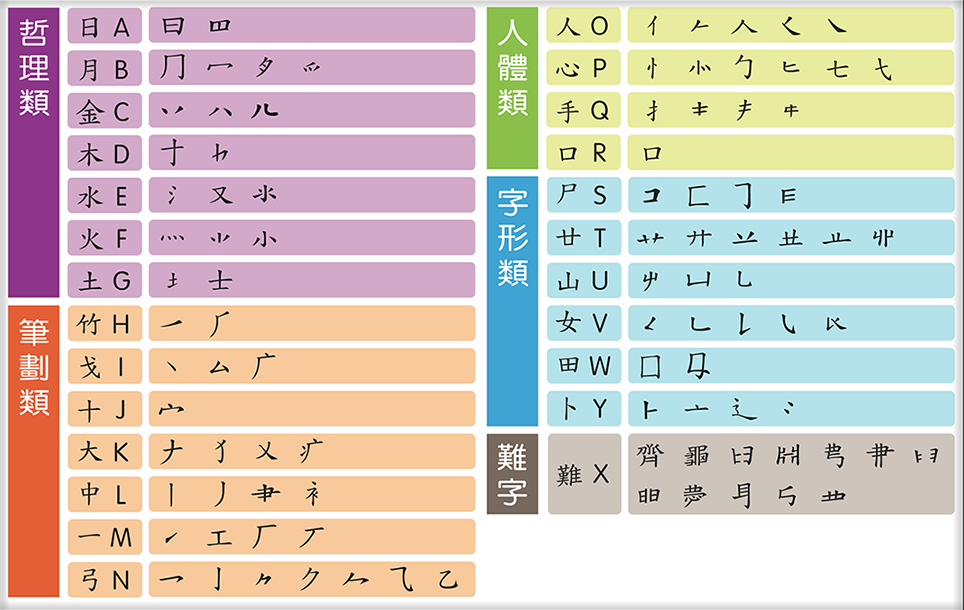 第一課 倉頡字母 哲理類 甚麼是倉頡輸入法 倉頡字母衍生輔助字形 倉頡字母和輔助字形表 鍵盤上的倉頡字母 對應鍵盤上的24個英文字母 倉頡字母分為四大類 哲理類的倉頡字母 倉頡字母「日」 對應英文字母「A」 「日」的第一個輔助字形是扁了的「日」 「日」的第二個輔助字形是橫置了的「日」 倉頡字母「月」 對應英文字母「B」 「月」的第一個輔助字形是取「月」字的「撇、橫折鈎」 「月」的第二個輔助字形是「冧宮頭」 「月」的第三個輔助字形是「傾斜的月字」 「月」的第四個輔助字形是「爪字頭」 倉頡字母「金」 對應英文字母「C」 「金」的第一個輔助字形是取「金」字的「點、撇」 「金」的第二個輔助字形是「八」字 「金」的第三個輔助字形是取「金」字的「點、撇」再上下倒轉 倉頡字母「木」 對應英文字母「D」 「木」的第一個輔助字形是「寸」字不要裡面的一點 「木」的第二個輔助字形是取「木」字不要左右兩邊再逆時針轉九十度 練習時間 字母練習(日月金木) 倉頡字母「水」 對應英文字母「E」 「水」的第一個輔助字形是「水」字的偏旁「三點水」 「水」的第二個輔助字形是「又」字 「水」的第三個輔助字形是「求」字下面的部份 倉頡字母「火」 對應英文字母「F」 「火」的第一個輔助字形是「火」字的偏旁「四點火」 「火」的第二個輔助字形是「火」字的上面的字形 「火」的第三個輔助字形是「小」字 倉頡字母「土」 對應英文字母「G」 「土」的第一個輔助字形是「土」字的字形特徵 「土」的第二個輔助字形是「士」字 練習時間 字母練習(水火土) 倉頡字母哲理類的注意事項 倉頡字母哲理類容易混淆的字形 倉頡字母哲理類容易混淆的字形 練習時間 字母練習(哲理類) 第一課 倉頡字母 哲理類 的課堂重點 第一課 倉頡字母 哲理類 的課堂重點