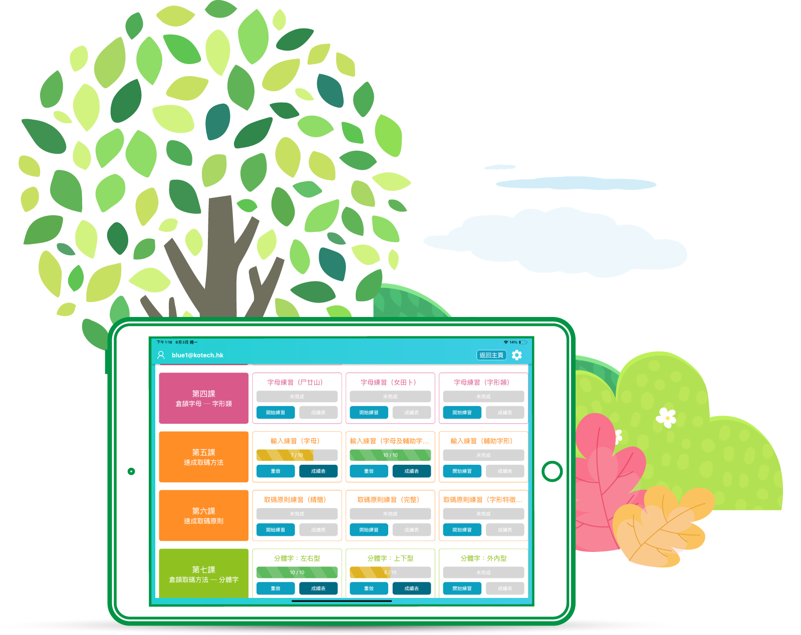完成課堂後,App設有三個不同程度的練習,除了令初學者鞏固所學的知識外,亦確保他們能夠徹底明白課堂的內容才開始下一課。